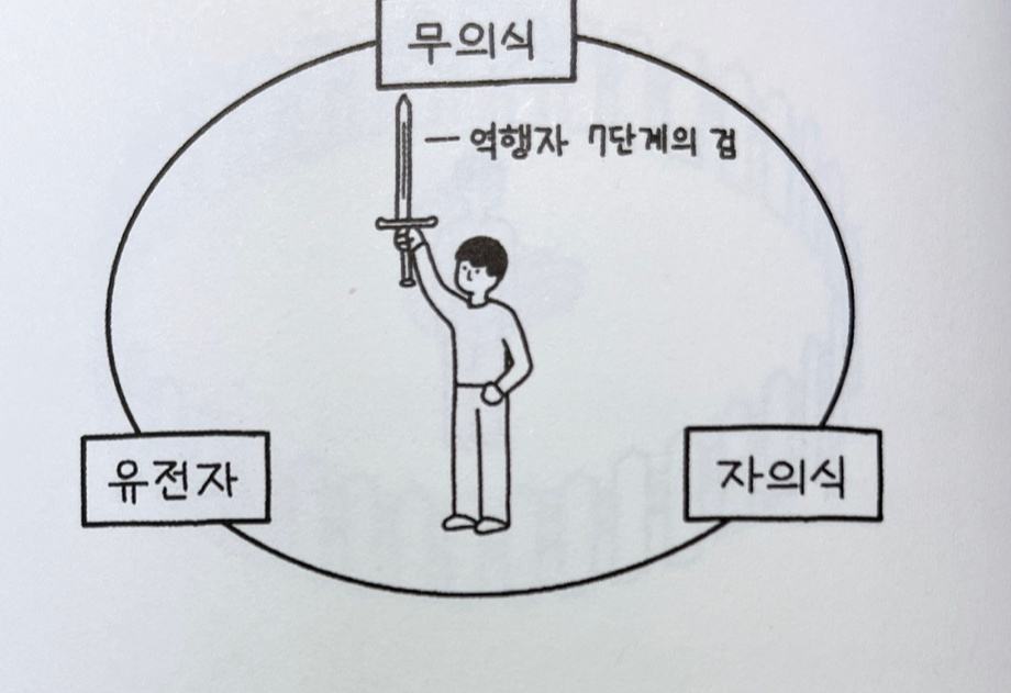 자청은 이런 무의식이 올라갔을 때 무의식을 그대로 반응하지 말고 그것을 깊이 파헤쳐서 내 무의식을 들여다보고 무의식을 뛰어넘으라고 합니다.