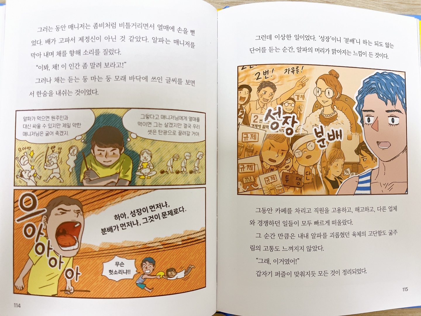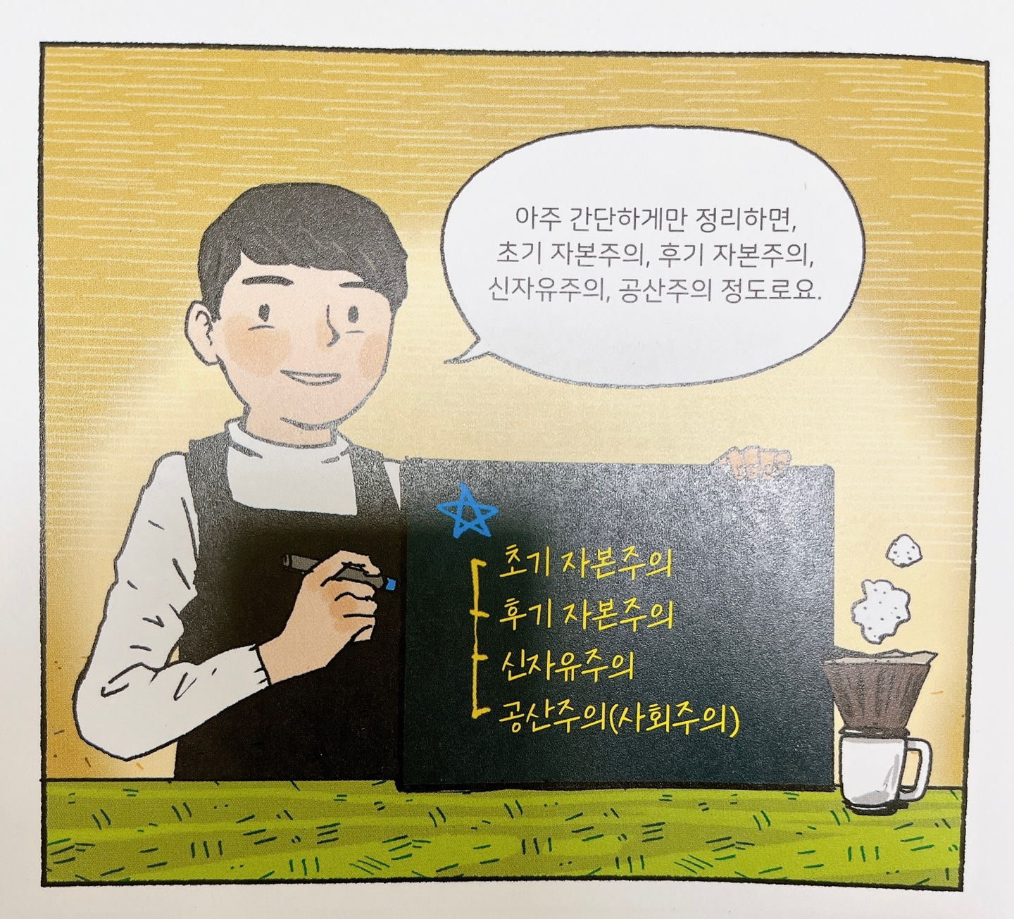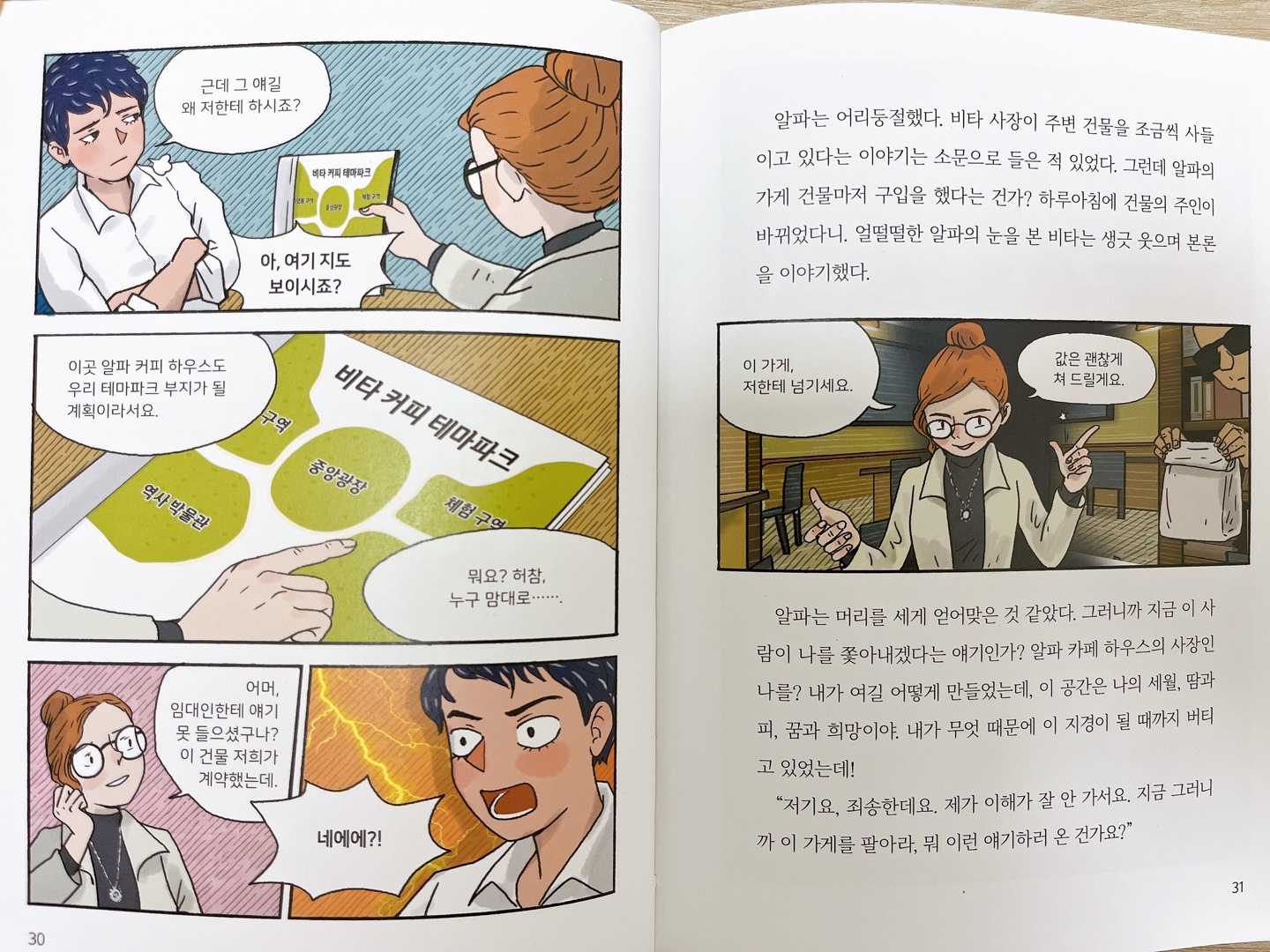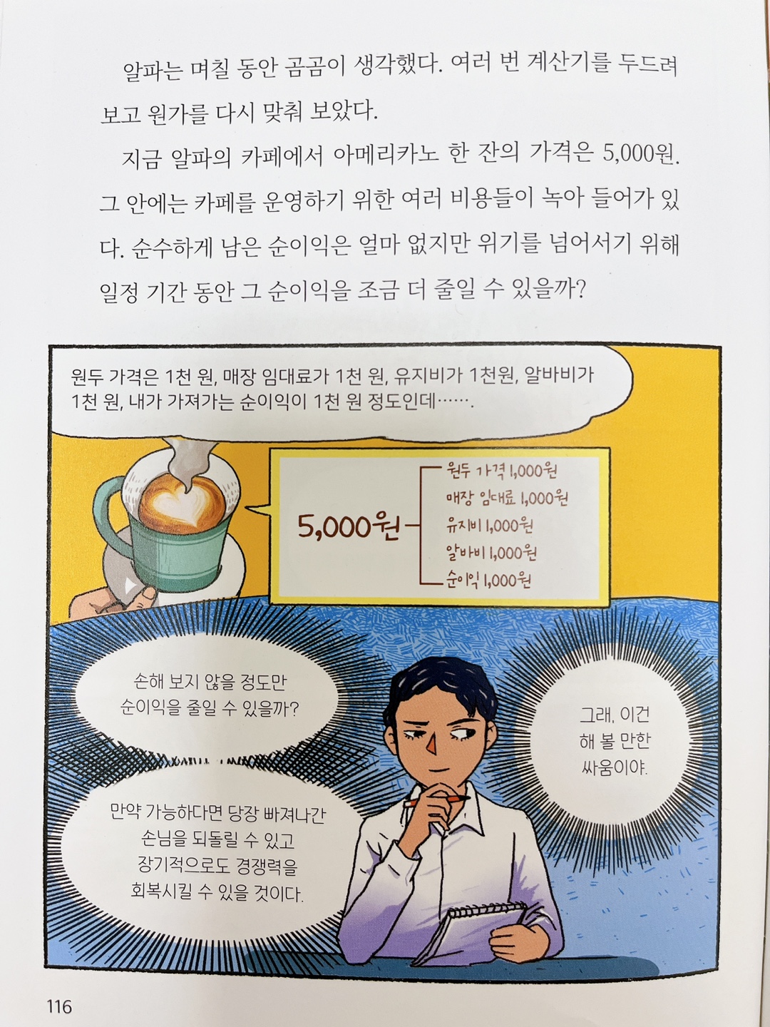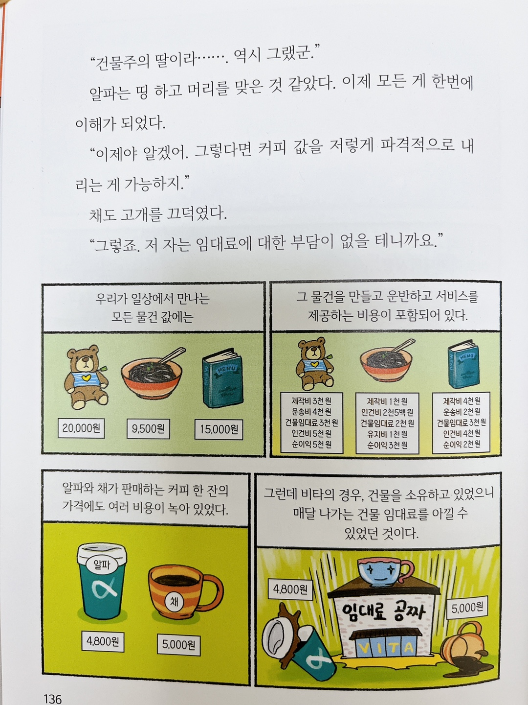 주인공은 자신의 생산수단을 만들기 위해서 카페사업을 시작하는데요. 곳곳에 카페가 생기면서 가격경쟁이라는 것을 하게 됩니다. 가격이 정해지는 것에 대해서 알 수 있지요. 결국 자본력의 차이의 한계를 맞이하게 됩니다.