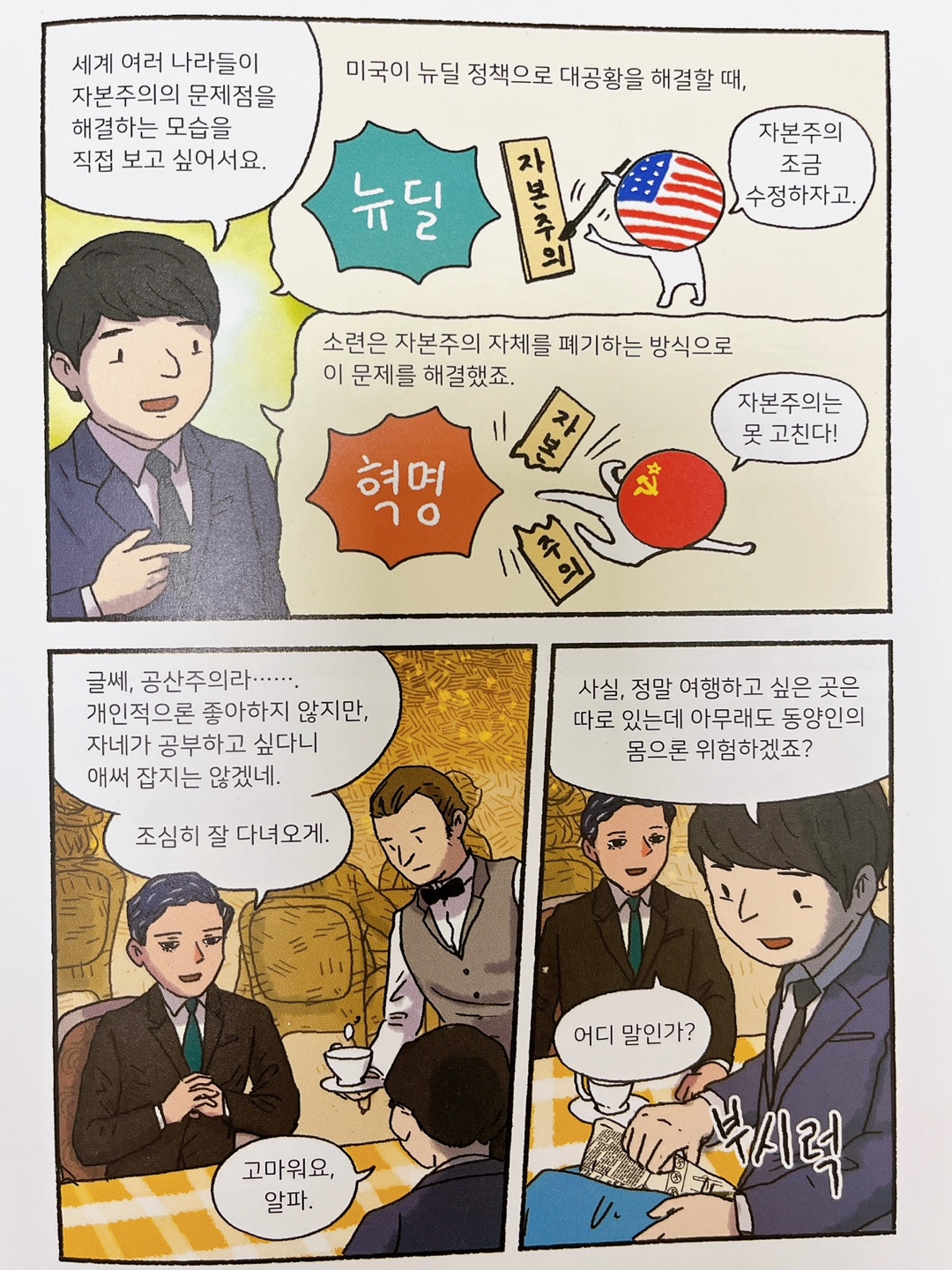 제1차 세계대전, 제2차 세계대전과 같은 전쟁은 많은 피해도 내지만 한편으로는 많은 부를 축적하게 해 주었죠. 전쟁하는 나라는 전쟁용품이 필요했고, 전쟁이 일어나지 않는 나라에서는 전쟁용품을 생산함으로써 막대한 부를 갖게 되며 미국은 강대국이 되었고, 세계는 미국과 소련이라는 자본주의와 공산주의의 냉전의 시대가 시작되고 소련이 붕괴되며 우리가 살고 있는 자본주의가 시작됩니다.